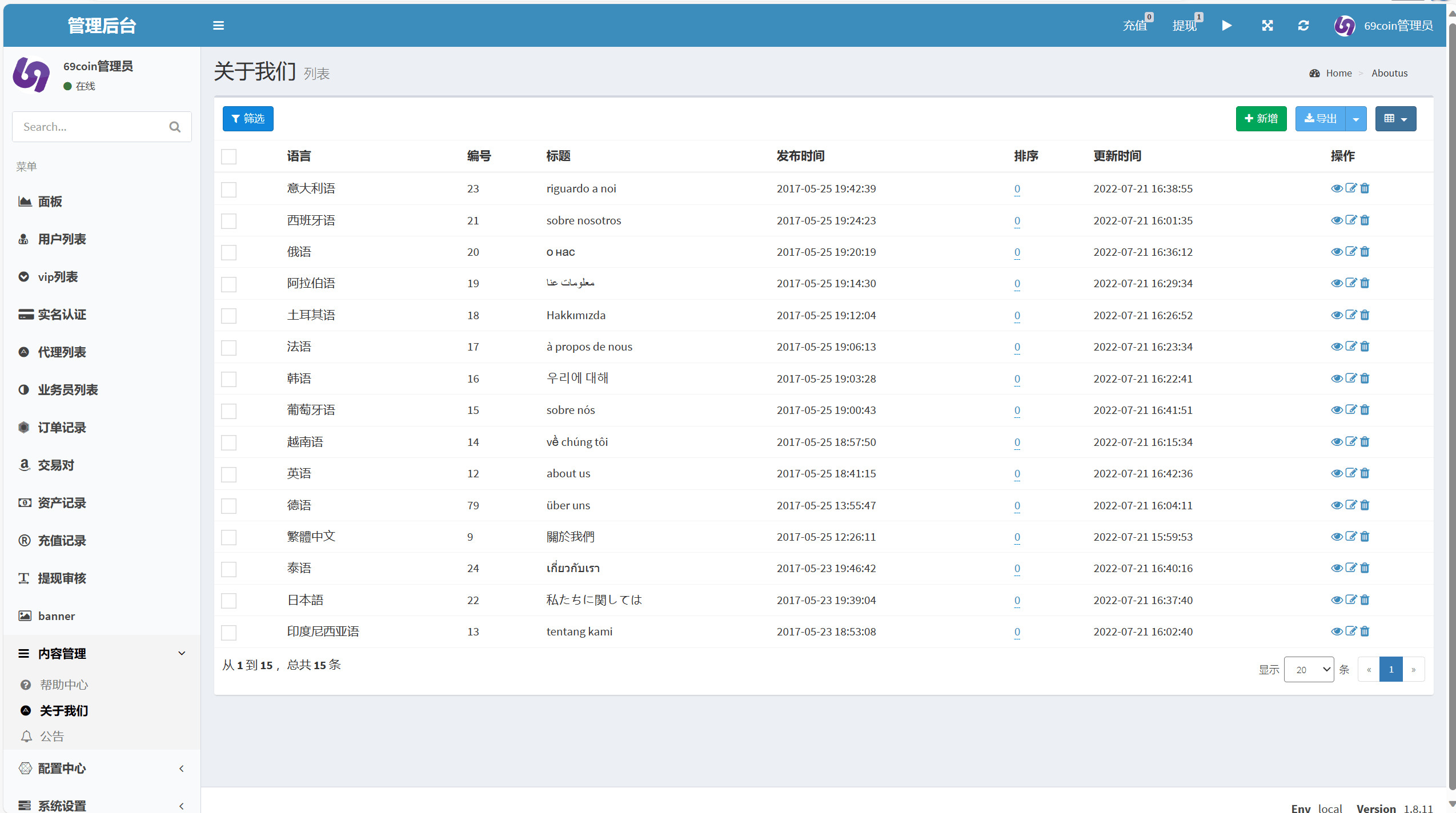 测试环境: 宝塔、Linux系统、PHP7.4、MySQL5.6,根目录public,伪静态larvael5,PHP需安装扩展:fileinfo、memcache、Redis、imap、intl、exif、xsl,PHP要删除全部禁用函数, 1.5G的图片数据,之前有团队运营过的,图片目录有很多国外的身份证、驾照、护照图片 我就删了没啥用还占内存 东西比较简单,纯合约模式,前端是vue编译后的,后端laravel5框架 K线好像是正常的,需要安装好环境并启动。中文繁体、英文两种语言 修改.env里面的域名、数据库信息、服务器ip 在public下面全局搜索 替换为自己的域名。